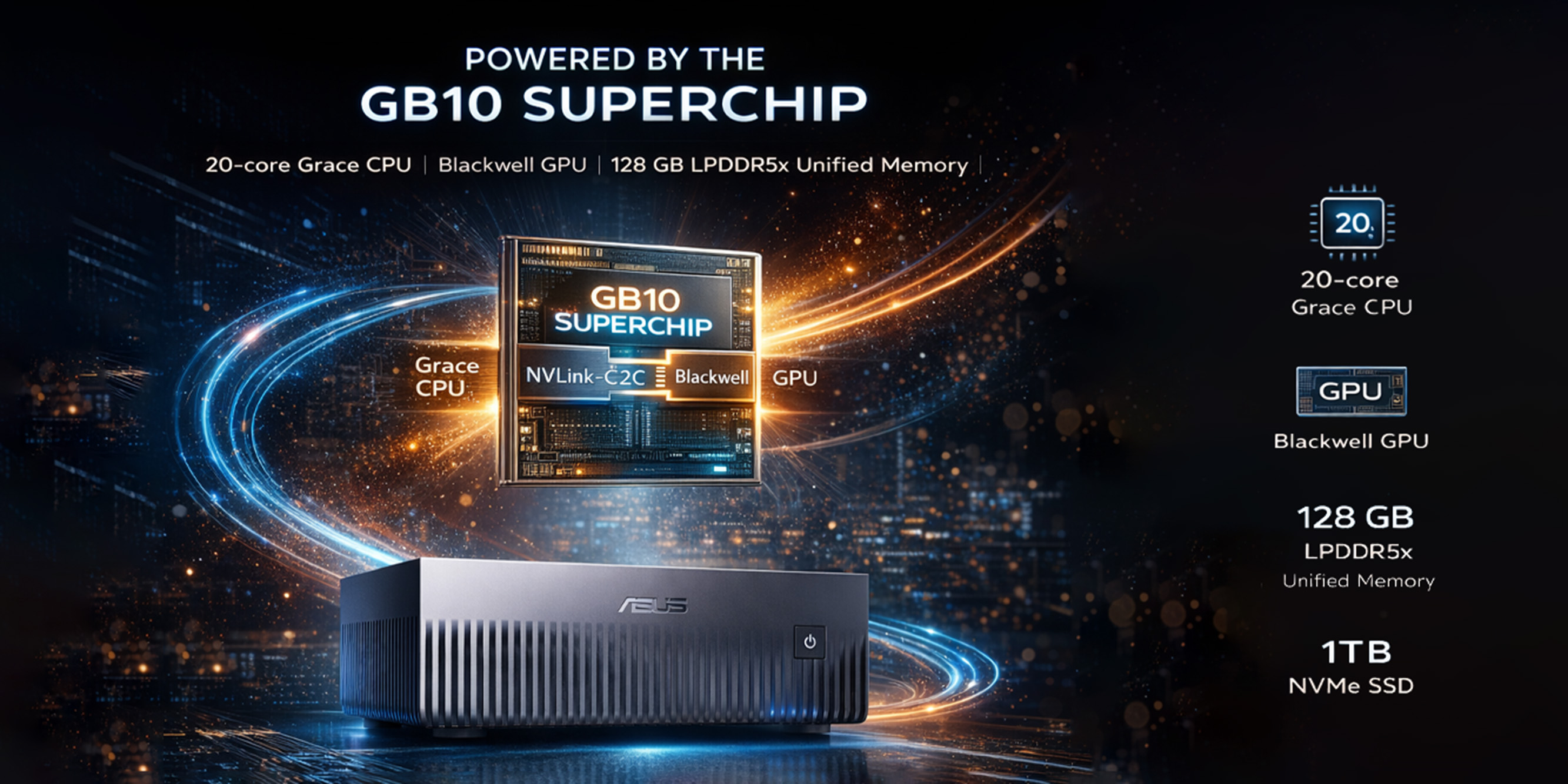 The GB10 Superchip includes a 20-core Arm-based Grace CPU and a Blackwell GPU. They connect through NVLink-C2C, allowing for fast data transfer. The chip has 128 GB of LPDDR5x unified memory, which can support models with up to 200 billion parameters. It also has a 1TB M.2 NVMe PCIe 4.0 SSD for quick storage.