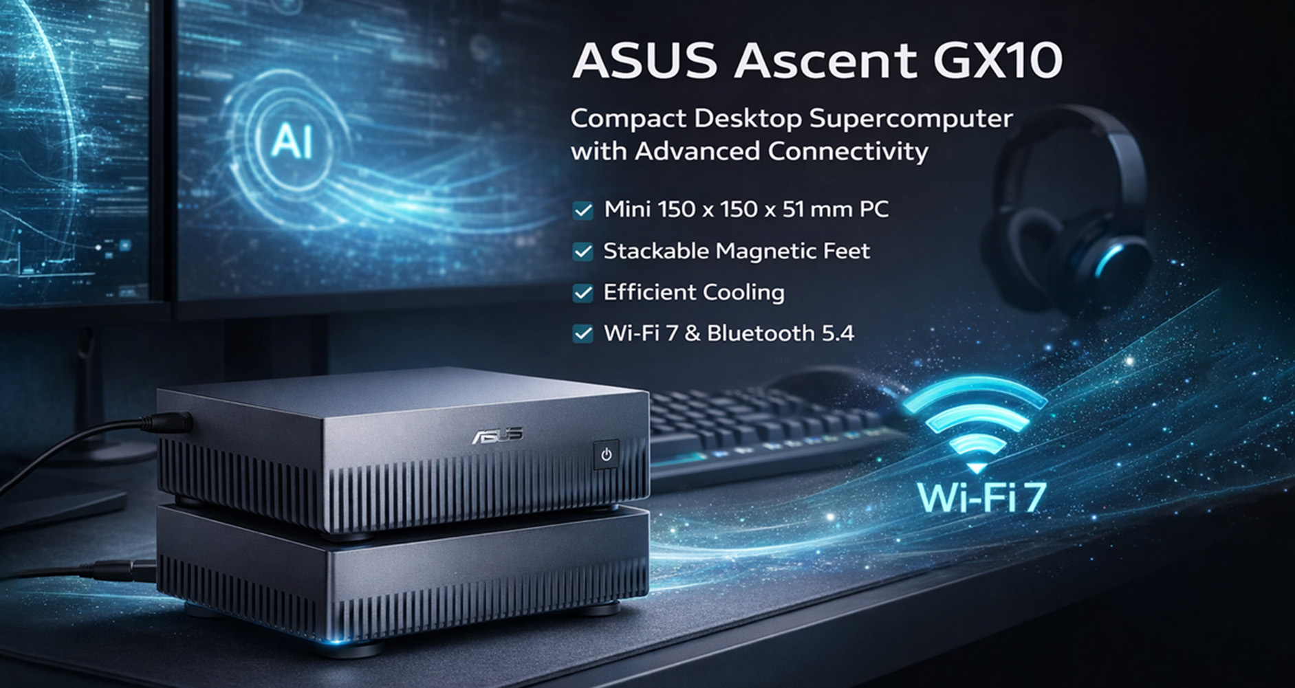 The ASUS Ascent GX10 is a sleek and compact desktop supercomputer, measuring just 150 x 150 x 51 mm. Its size allows it to fit seamlessly on any desk, and it features stackable magnetic feet, making it easy to organize. The GX10 is designed with efficient cooling, ensuring optimal performance even during demanding tasks. It boasts advanced connectivity options, supporting the latest Wi-Fi 7 and Bluetooth 5.4 standards, which enhance its capability for cutting-edge edge AI networking.