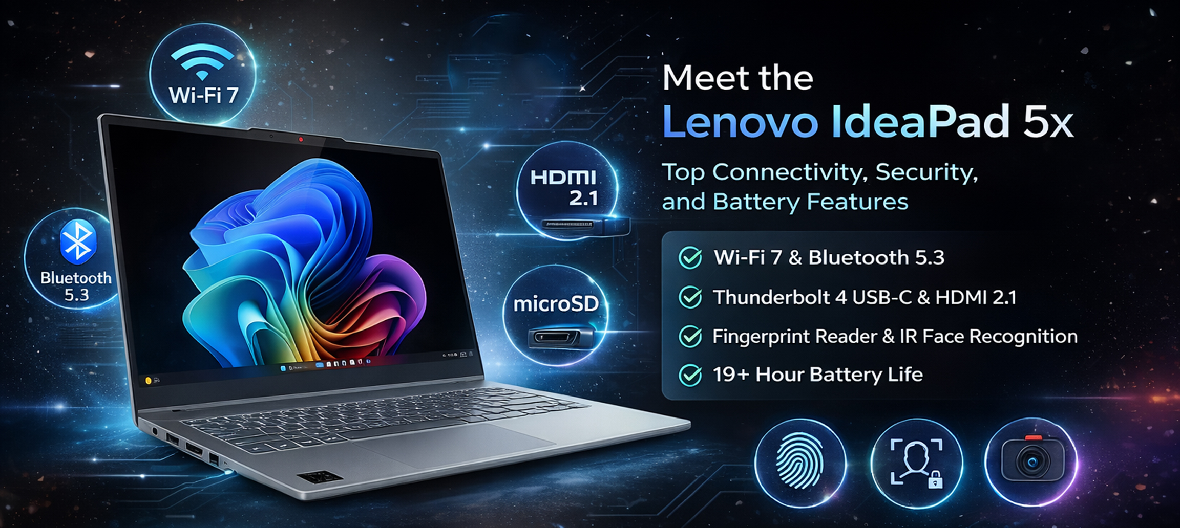 The IdeaPad 5x has the newest connection options like Wi-Fi 7, Bluetooth 5.3, USB-C with Thunderbolt 4 (on some models), HDMI 2.1, and a microSD card slot. This makes it easy to connect to external screens and devices. It also has strong security features like a fingerprint reader, face recognition with Windows Hello IR camera, and a privacy cover for the webcam.