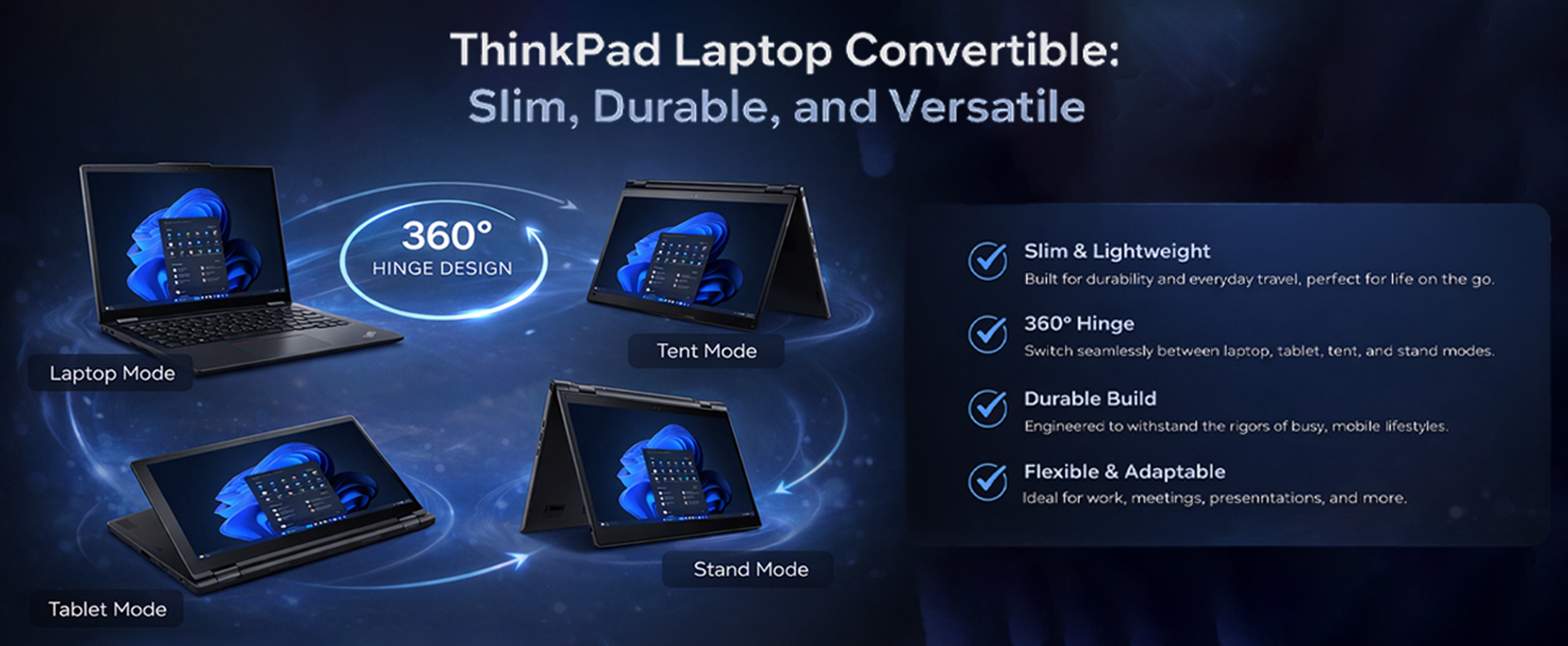 Its slim, lightweight body is engineered for durability and everyday travel. The 360-degree hinge allows smooth switching between laptop, tablet, tent, or stand modes, making it adaptable for work, meetings, or presentations.