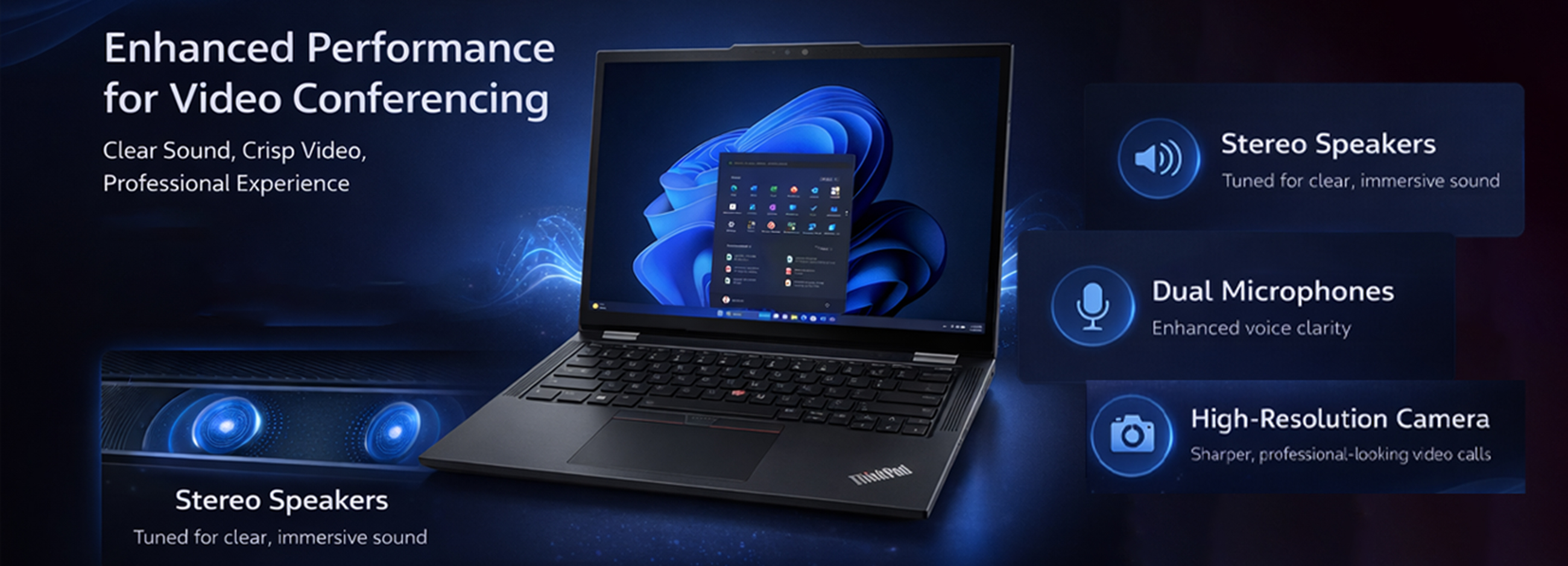 Stereo speakers tuned for clear sound and dual microphones improve video calls and meetings. The high-resolution front camera ensures sharper and more professional-looking video conferencing.