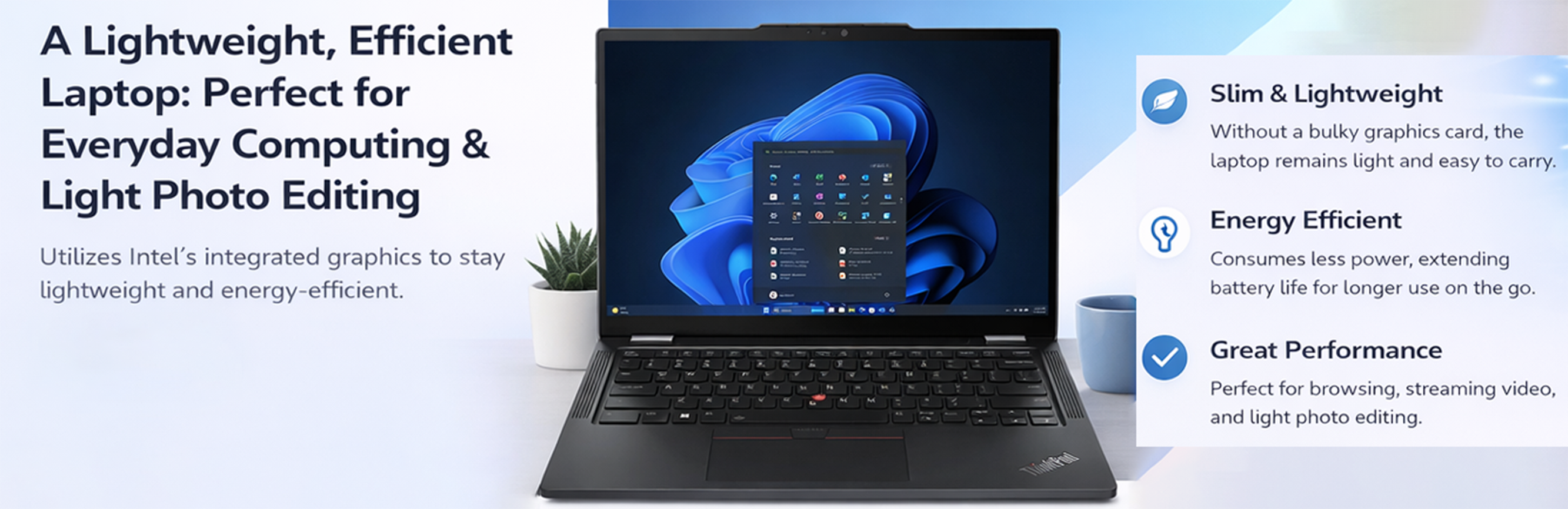 Utilizes Intel's integrated graphics, making it suitable for everyday computing, video playback, and light photo editing. This approach keeps the laptop lightweight and energy-efficient by eliminating the need for a dedicated graphics card.