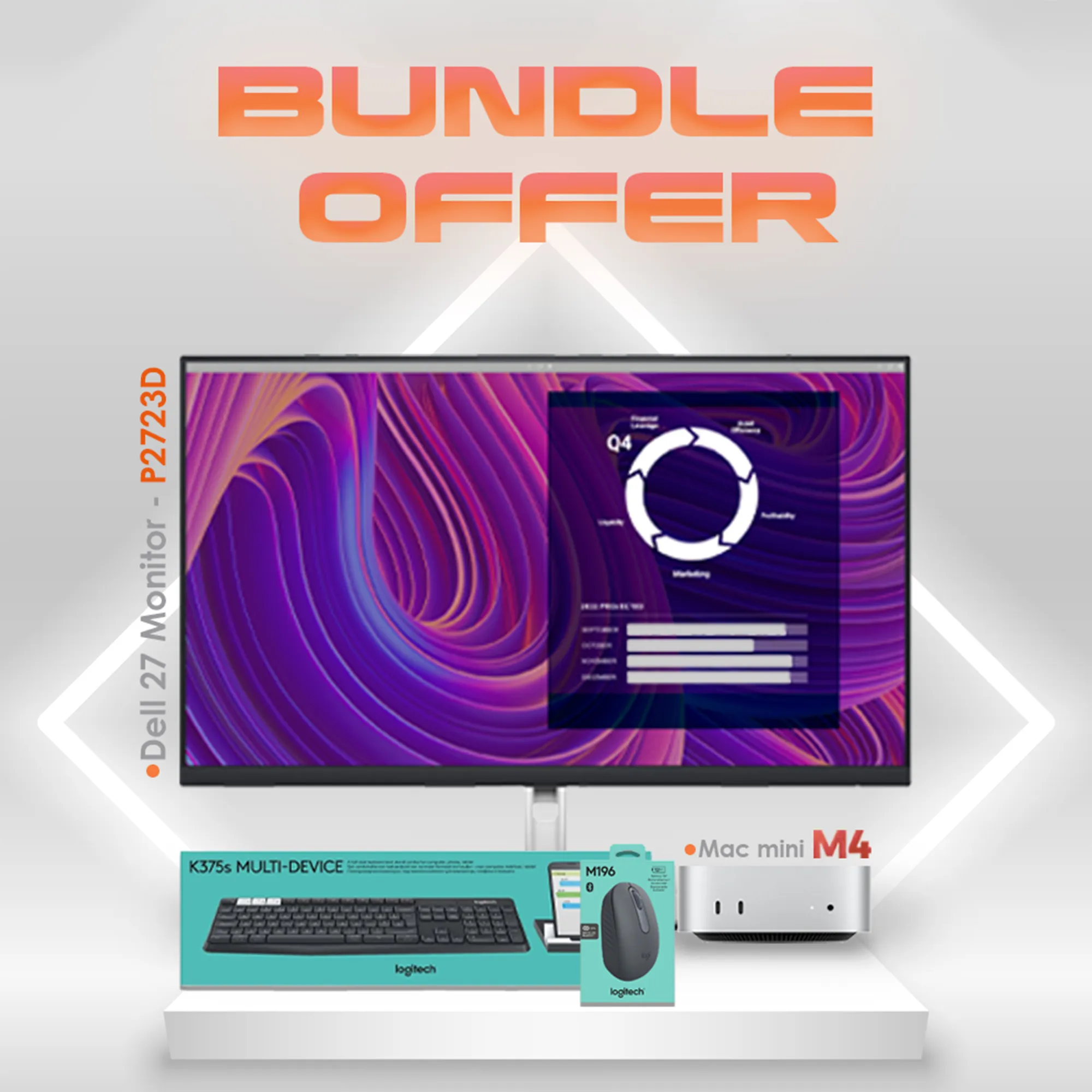 A bundle offer that includes a Mac Mini M4, a Dell P2723D monitor, a Logitech K375e Bluetooth keyboard, and a Logitech M196 Bluetooth mouse typically means that these products are sold together as a single package.
