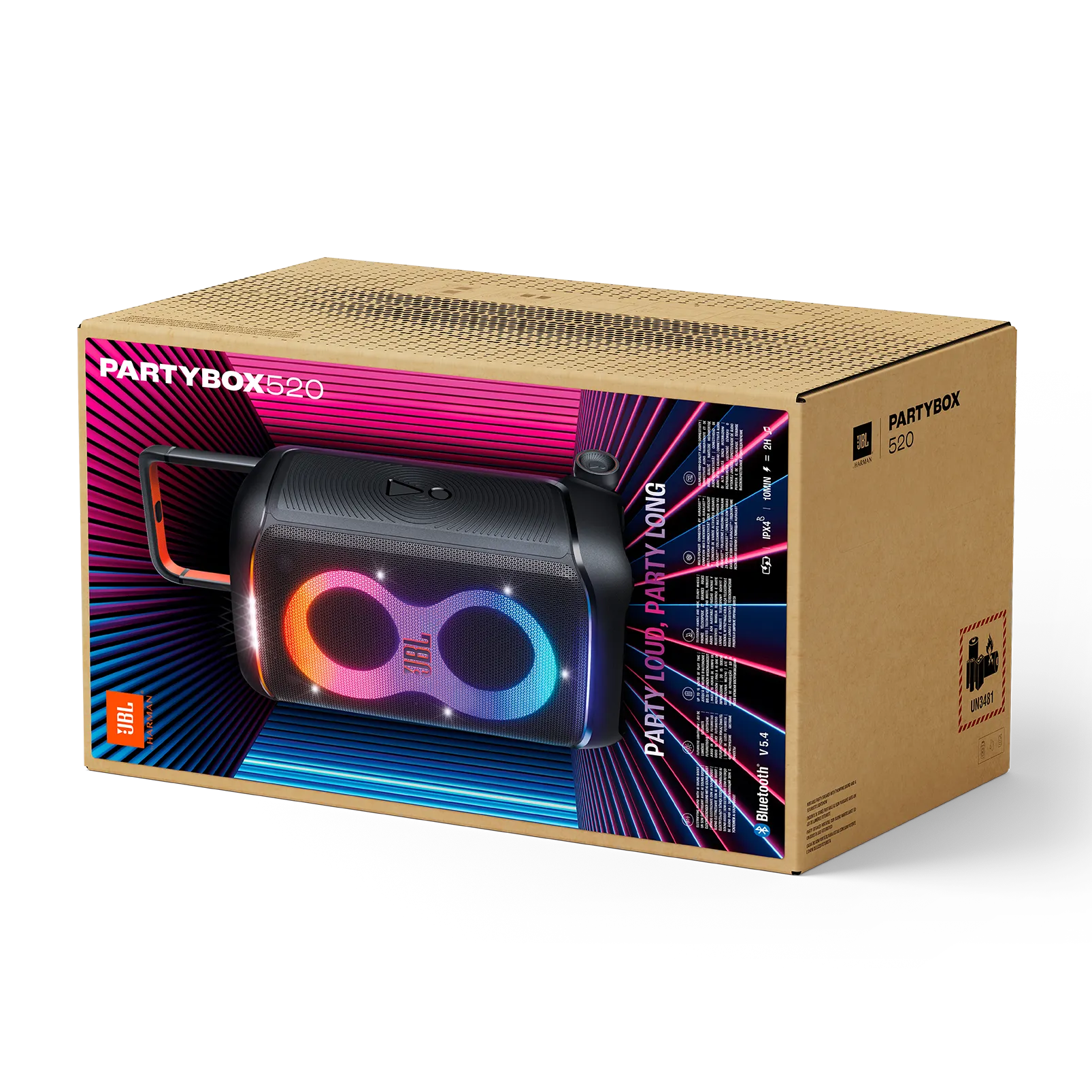The JBL PartyBox 520 is a portable speaker with 400W output, 18-hour battery life, IPX4 splash resistance, and Bluetooth 5.4 for multi-speaker pairing.