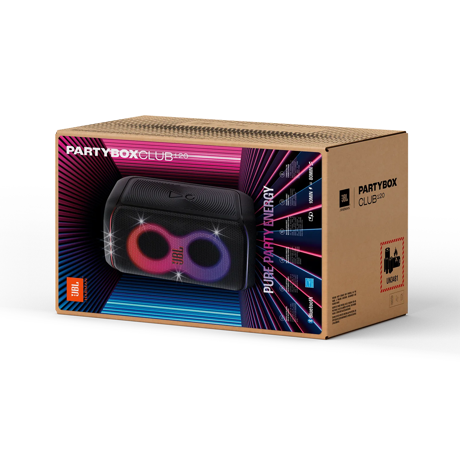 The JBL PartyBox Club 120 is a 160 W portable speaker with rich sound, up to 12 hours of playback, and fast-charging. It features Bluetooth 5.3, multiple inputs, and a fun RGB lightshow, all controllable via the JBL PartyBox app.