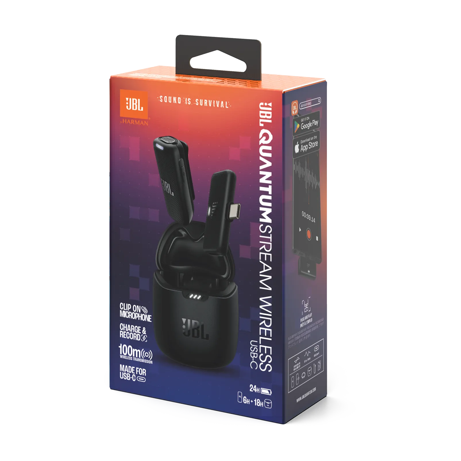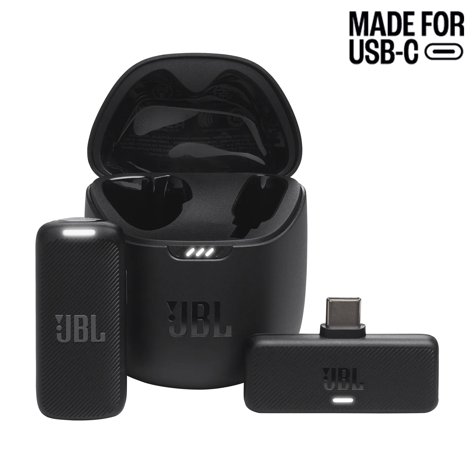 The JBL Quantum Stream Wireless USB-C Microphone is a clip-on mic ideal for streaming, featuring 2.4GHz wireless connectivity, 100 Hz–20 kHz frequency response, adjustable noise cancellation, and up to 6 hours of battery life (24+ with the case). It includes a mute button and quick charging. Dimensions are 52x22x19mm and weigh 11.2g.