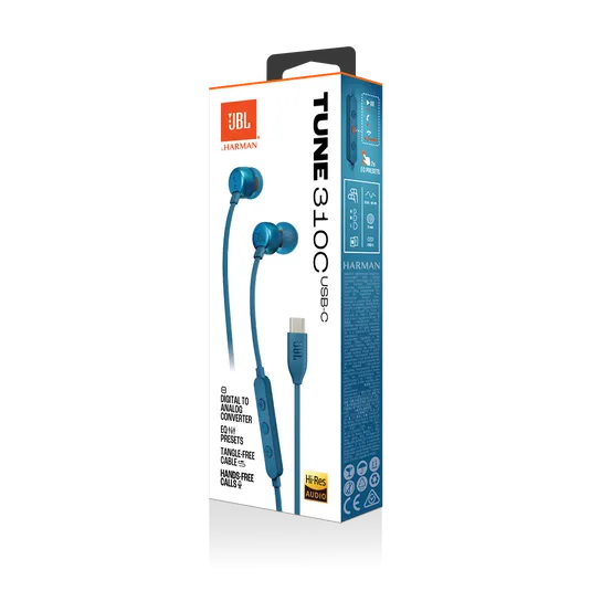 The JBL T310C is a USB-C in-ear headphone with 9 mm drivers, 20 Hz – 40 kHz frequency response, and three EQ modes. It features a tangle-free cable, a mic, and is compatible with USB-C devices.