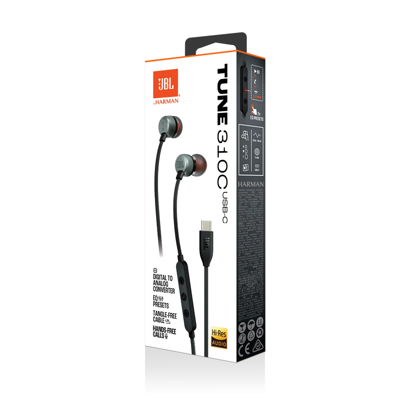 The JBL T310C is a USB-C in-ear headphone with 9 mm drivers, 20 Hz – 40 kHz frequency response, and three EQ modes. It features a tangle-free cable, a mic, and is compatible with USB-C devices.