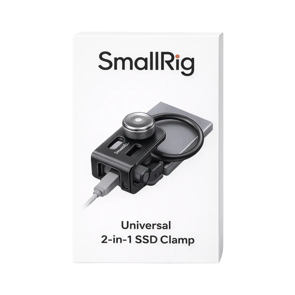The SmallRig 4779 SSD Clamp securely holds portable SSDs (8-16mm thick) with a compact design. It features a cold shoe mount for cameras and a MagSafe base for iPhones, ideal for mobile filming.